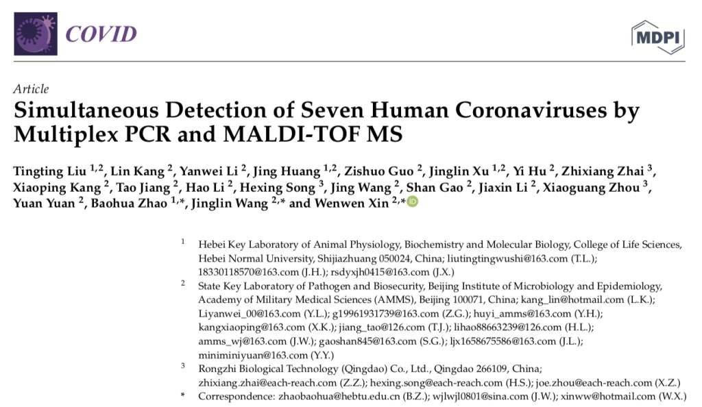 由軍事醫(yī)學(xué)科學(xué)院微生物流行病研究所、河北師范大學(xué)河北省動物生理生化與分子生物學(xué)重點實驗室相關(guān)領(lǐng)域?qū)<依?strong>融智生物科技(青島)有限公司自主知識產(chǎn)權(quán)的核酸質(zhì)譜系統(tǒng),聯(lián)合開發(fā)的可聯(lián)合檢測7種人冠狀病毒的檢測方法,發(fā)表于2022年1月的《 COVID》上。