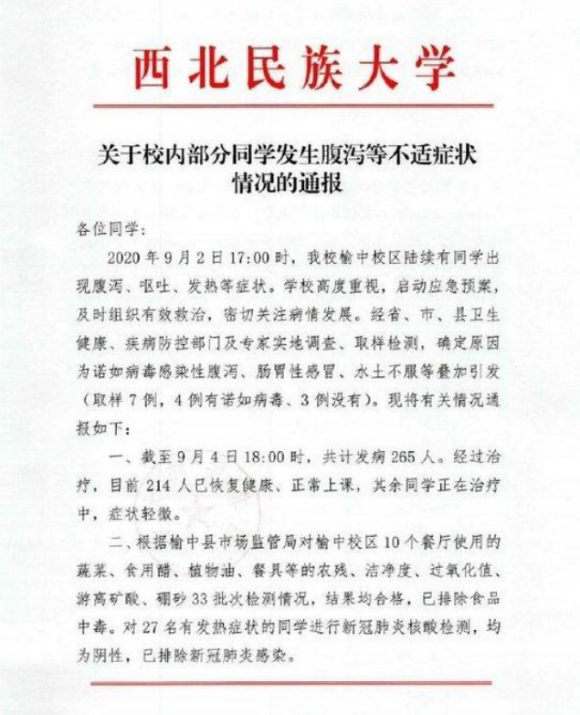 9月2日,西北民族大學(xué)通報(bào):榆中校區(qū)陸續(xù)有同學(xué)出現(xiàn)腹瀉、嘔吐、發(fā)熱等癥狀。學(xué)校高度重視,啟動(dòng)應(yīng)急預(yù)案,及時(shí)組織有效救治,密切關(guān)注病情發(fā)展。經(jīng)省、市、縣衛(wèi)生健康、疾病防控部門及專家實(shí)地調(diào)查、取樣檢測(cè),確定原因?yàn)橹Z如病毒感染性腹瀉、腸胃性感冒、水土不服等疊加引發(fā)(取樣7例,4例有諾如病毒、3例沒有)。