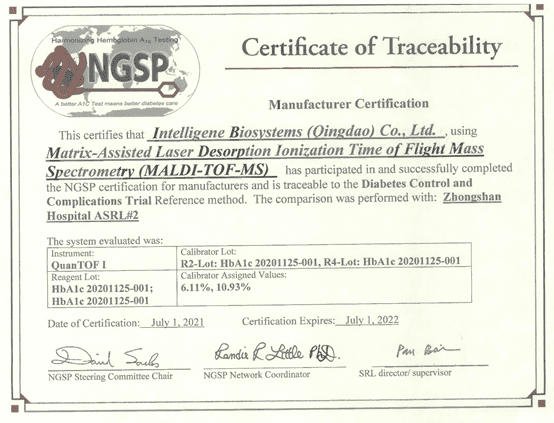 融智生物新一代寬譜定量飛行時(shí)間質(zhì)譜NGSP認(rèn)證證書(shū)