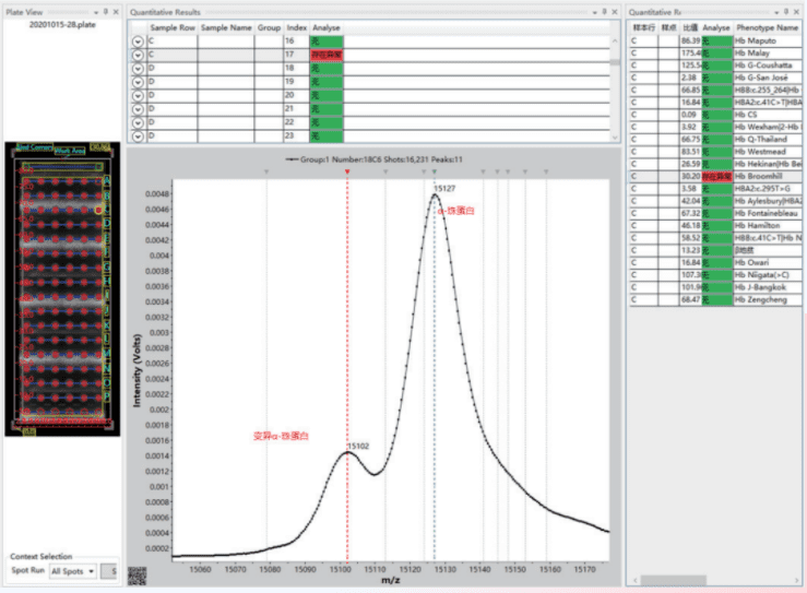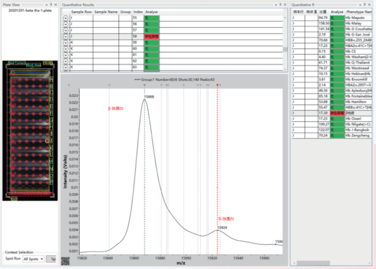 基于MALDI-TOF MS的血紅蛋白病表型篩查系統(tǒng),可實(shí)現(xiàn)對(duì)?β- 地中海貧血(圖 1)和近100種異常血紅蛋白的檢測(cè)(圖 2, 3)