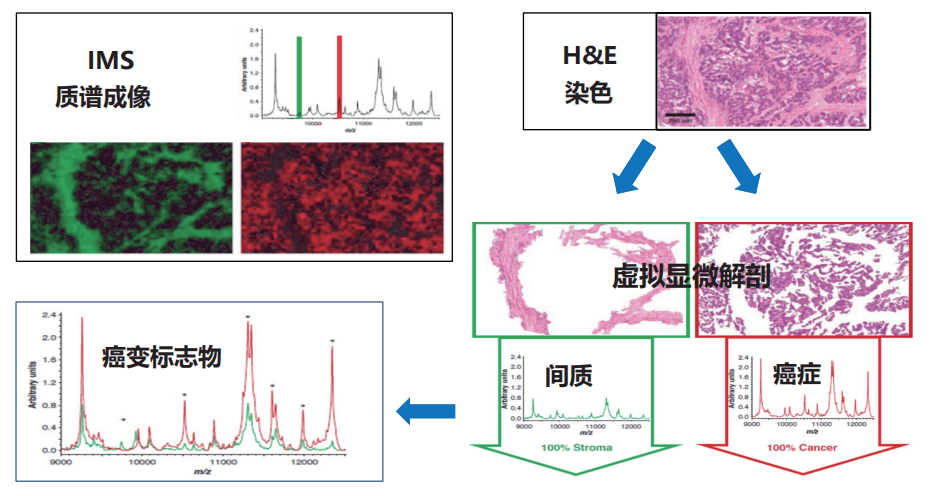 通過HE染色技術(shù)可以看到癌變組織與間質(zhì)差異,而通過癌變與間質(zhì)質(zhì)譜成像圖譜比較證實(shí)了差異峰存在。