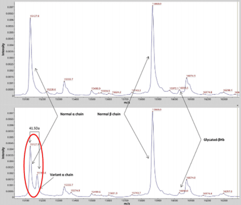 注:上圖為正常人質(zhì)譜圖,下圖為先證者 Hb- 遼寧質(zhì)譜圖。